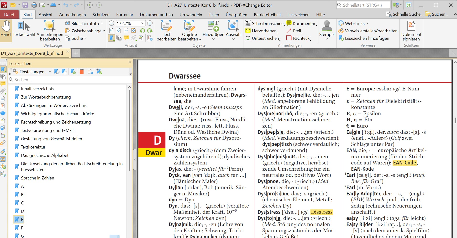 PDF-Datei des Duden in PDF-Exchange geöffnet, mit Lesezeichen